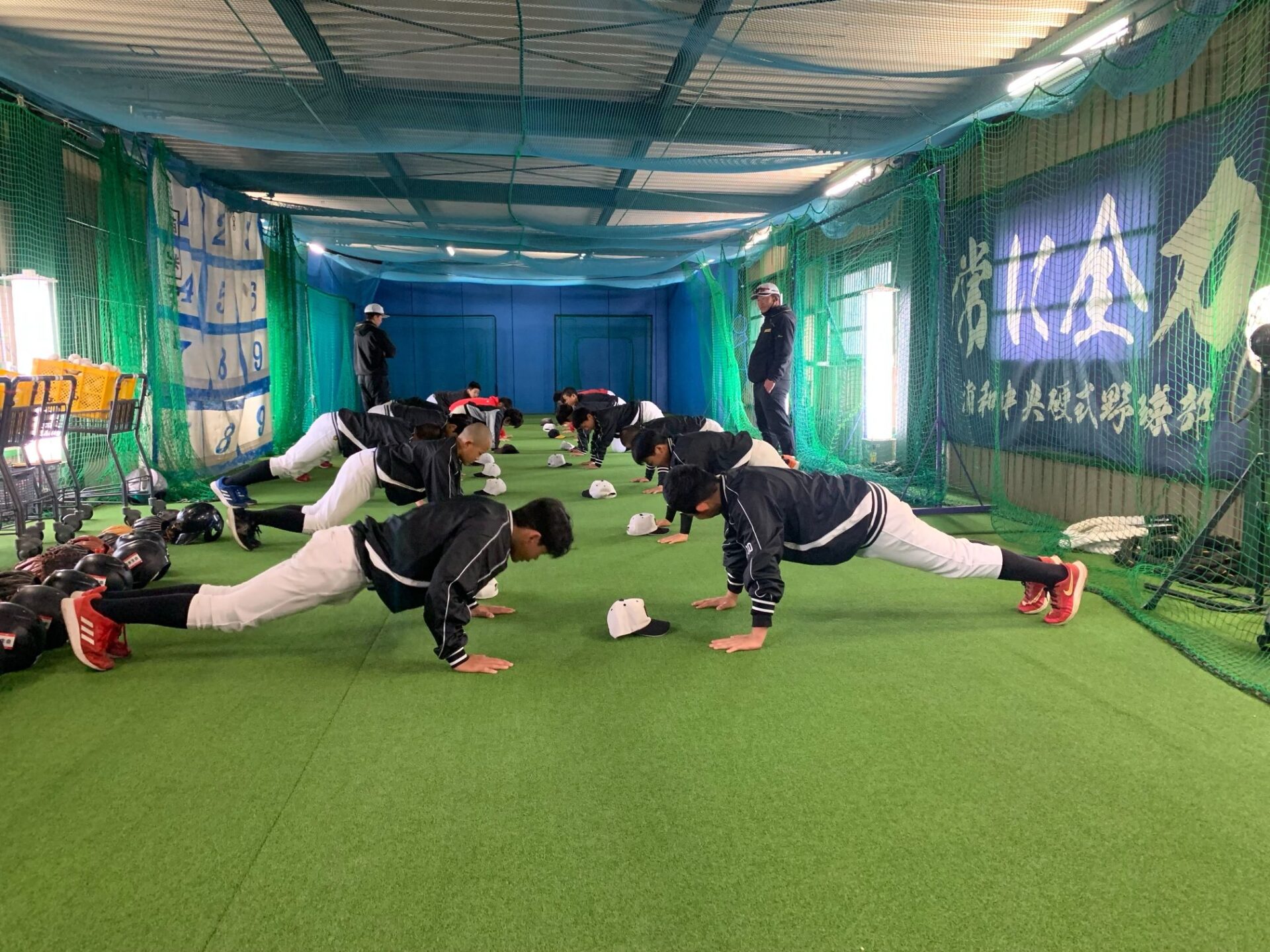 おしっ、久しぶりの室内練習場でした。カラダつくりから始まり、バッティング、プルペン入りとしました。